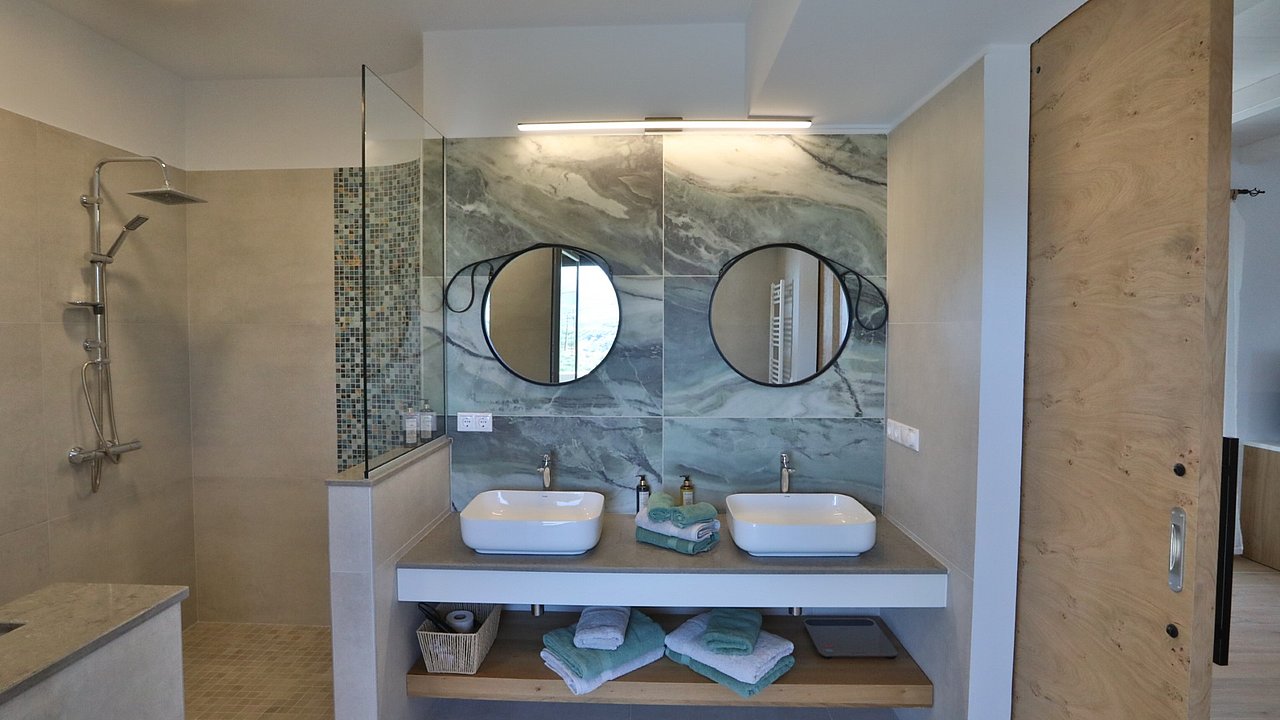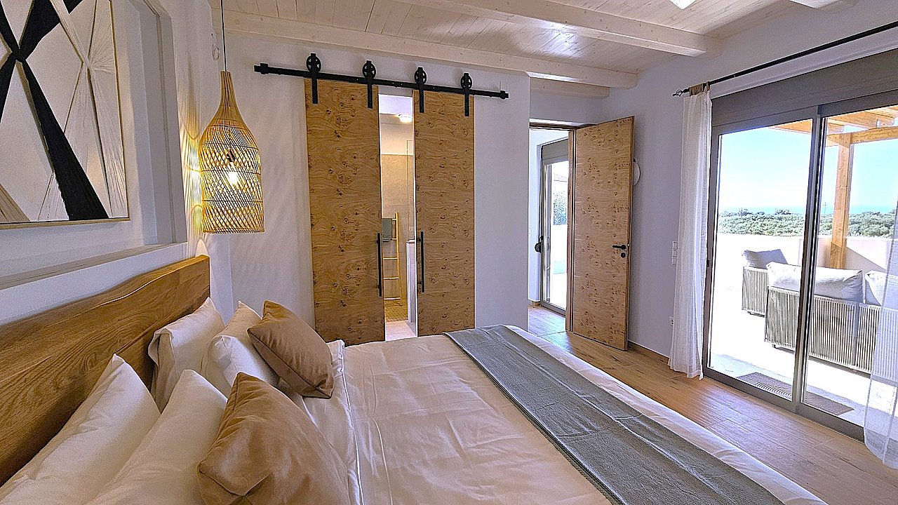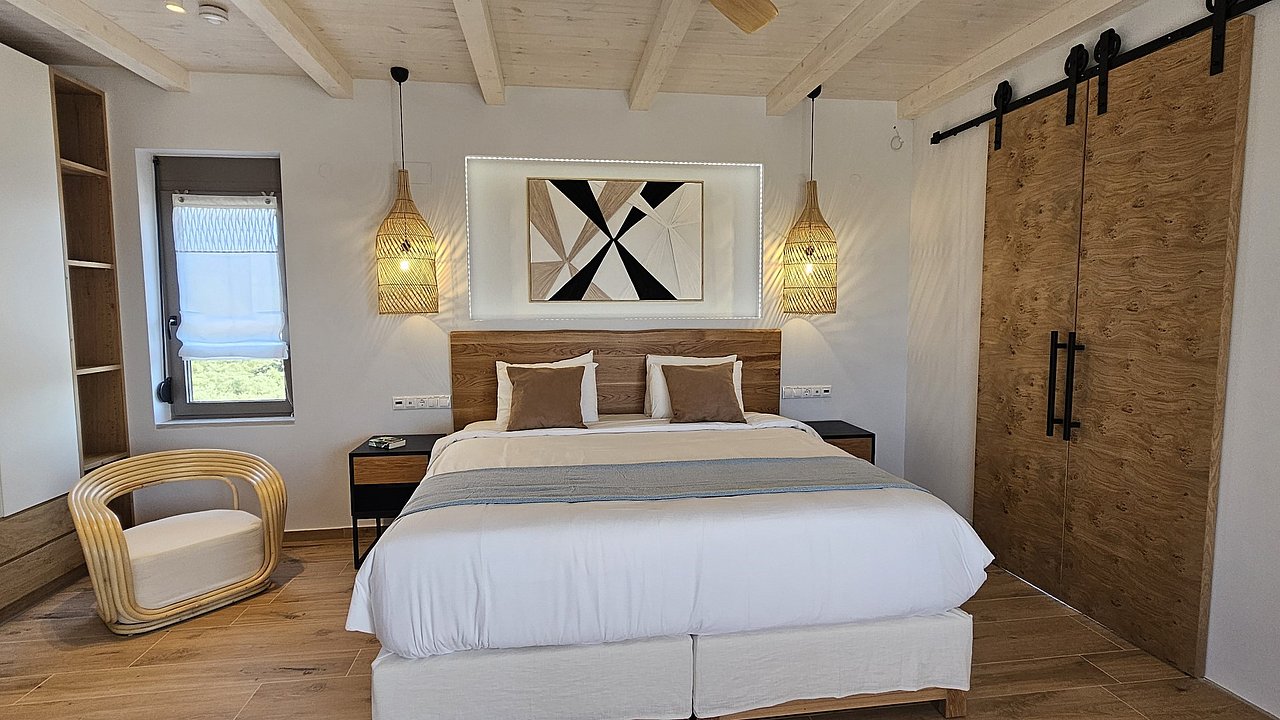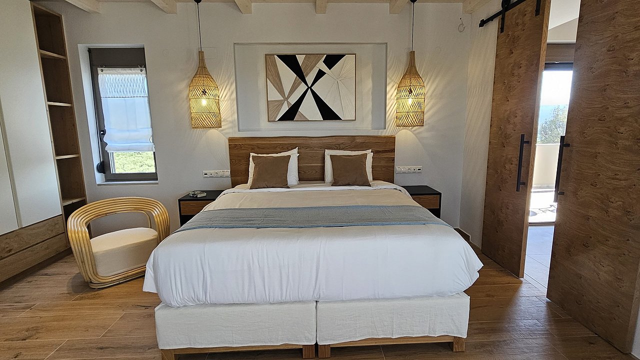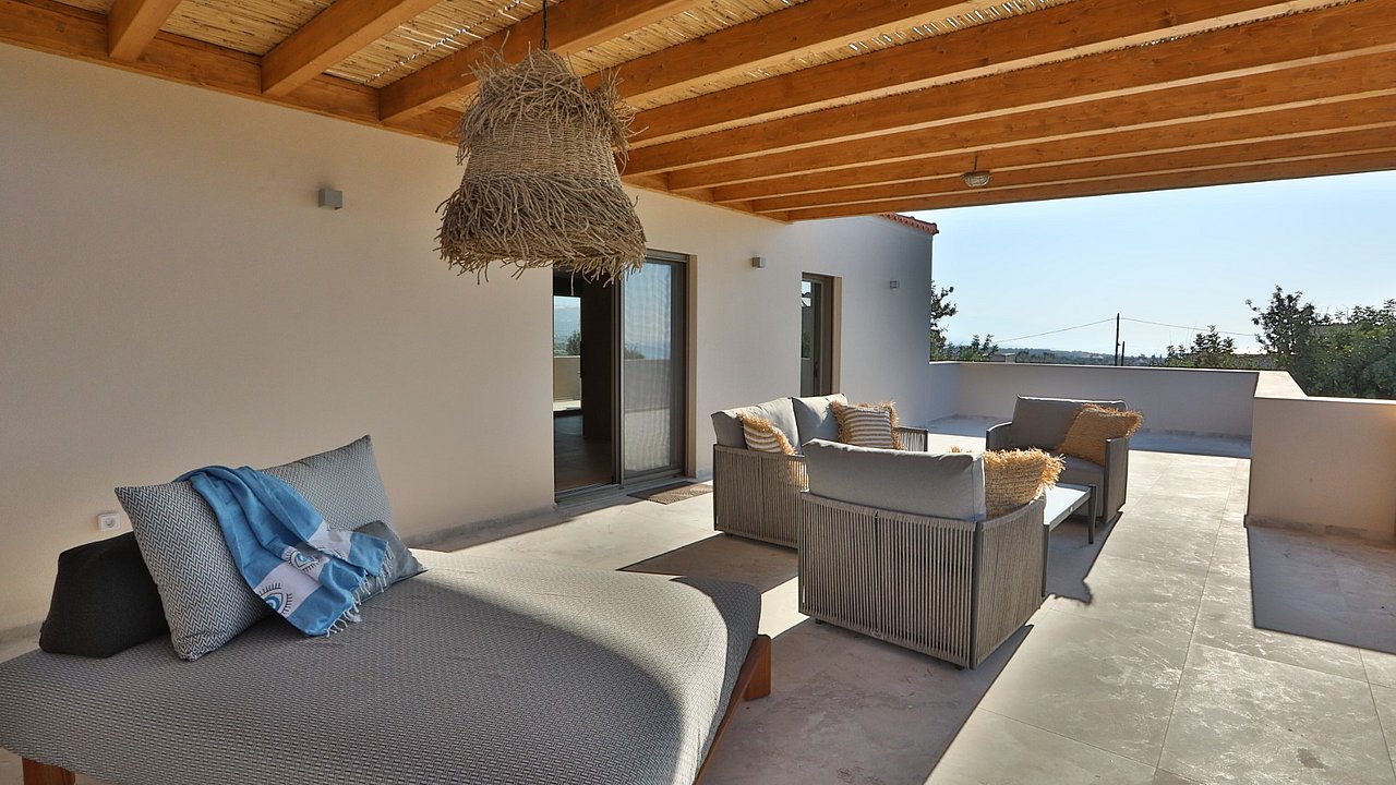 Das obere Schlafzimmer bietet Zugang zu zwei privaten Außenbereichen- einer großen Terasse mit direktem Zugang vom Bad , sowie eines der Herzstücke der Villa Ephelia- die weitläufige Dachterasse mit einer atemberaubenden Ansicht und sorgfätig ausgewählten luxuriösen Designer Möbel, die Komfort auf höchstem Niveau versprechen. Perfekt für Stille Sonnenaufgänge oder entspannte Abende unter freiem Himmel.