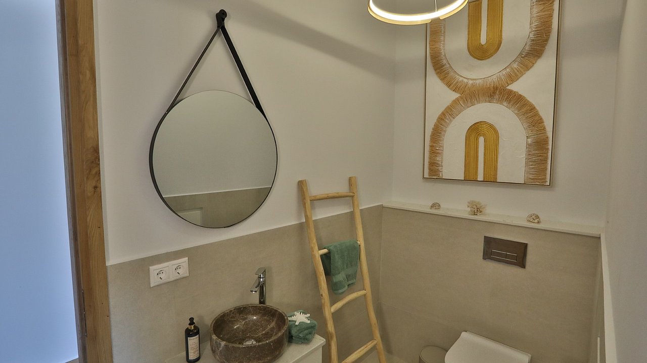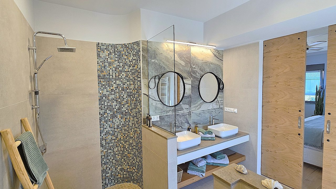 Großzügige, beleuchtete Einbauschränke bieten viel Stauraum und sorgen mit ihrem sanften Licht beim Öffnen für eine besondere Atmosphäre. Für ihr Wohlbefinden stehen Ihnen ein Safe, Bademäntel, Hausschuhe, sowie Smart TVs in beiden Schlafzimmern zur Verfügung.