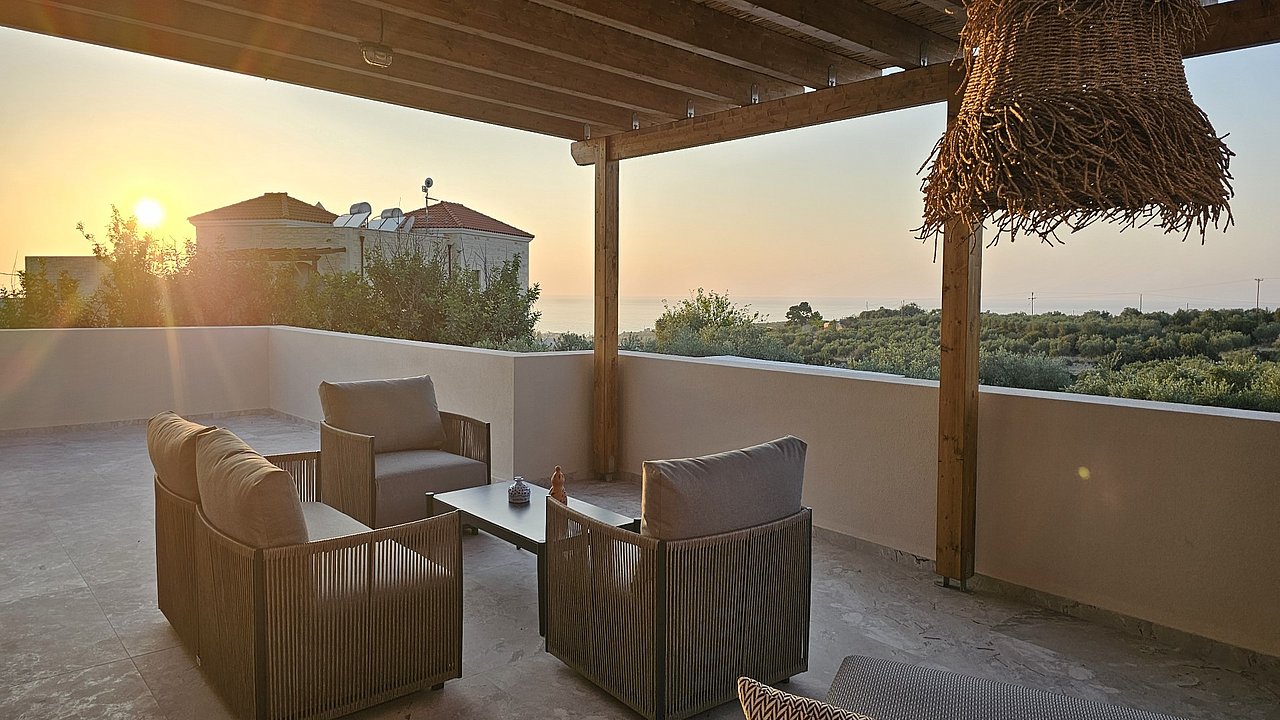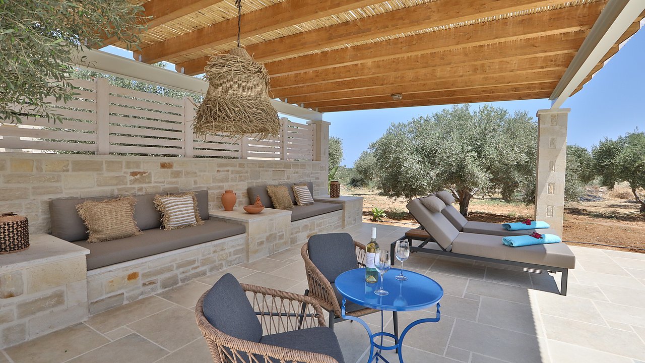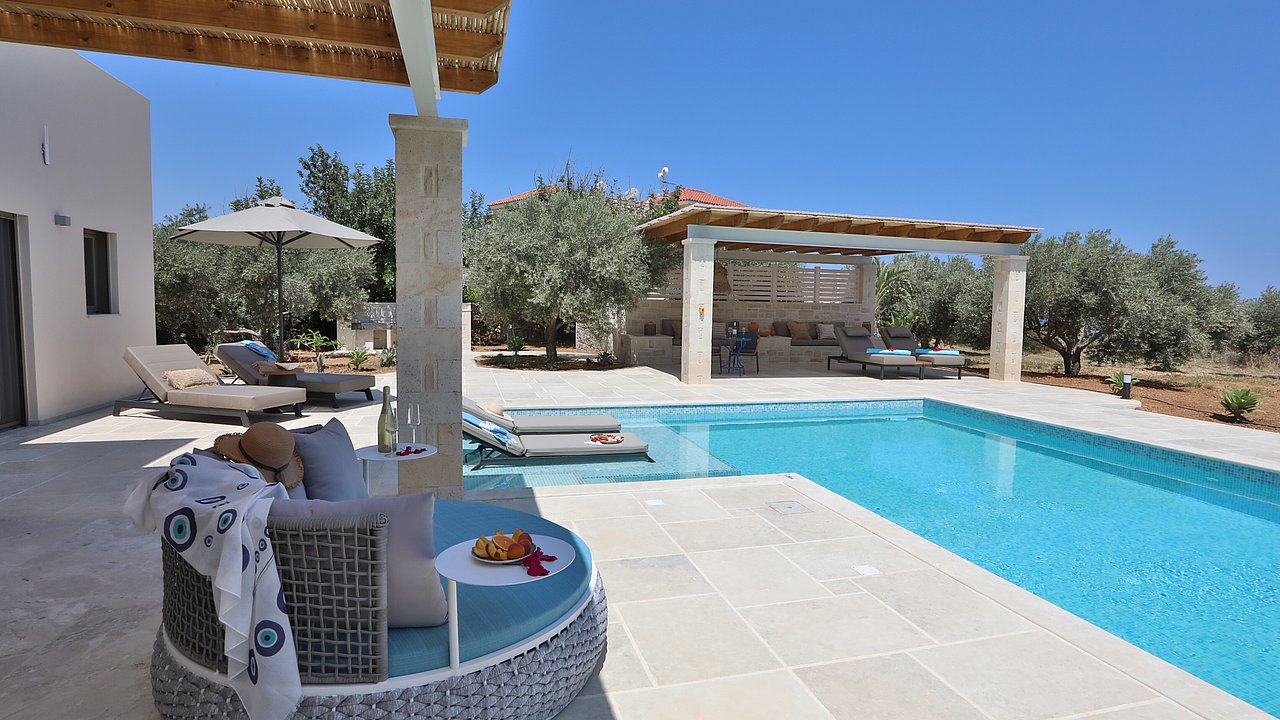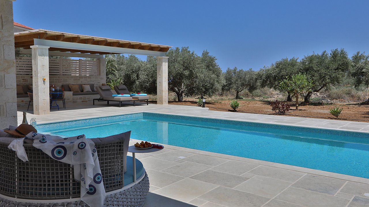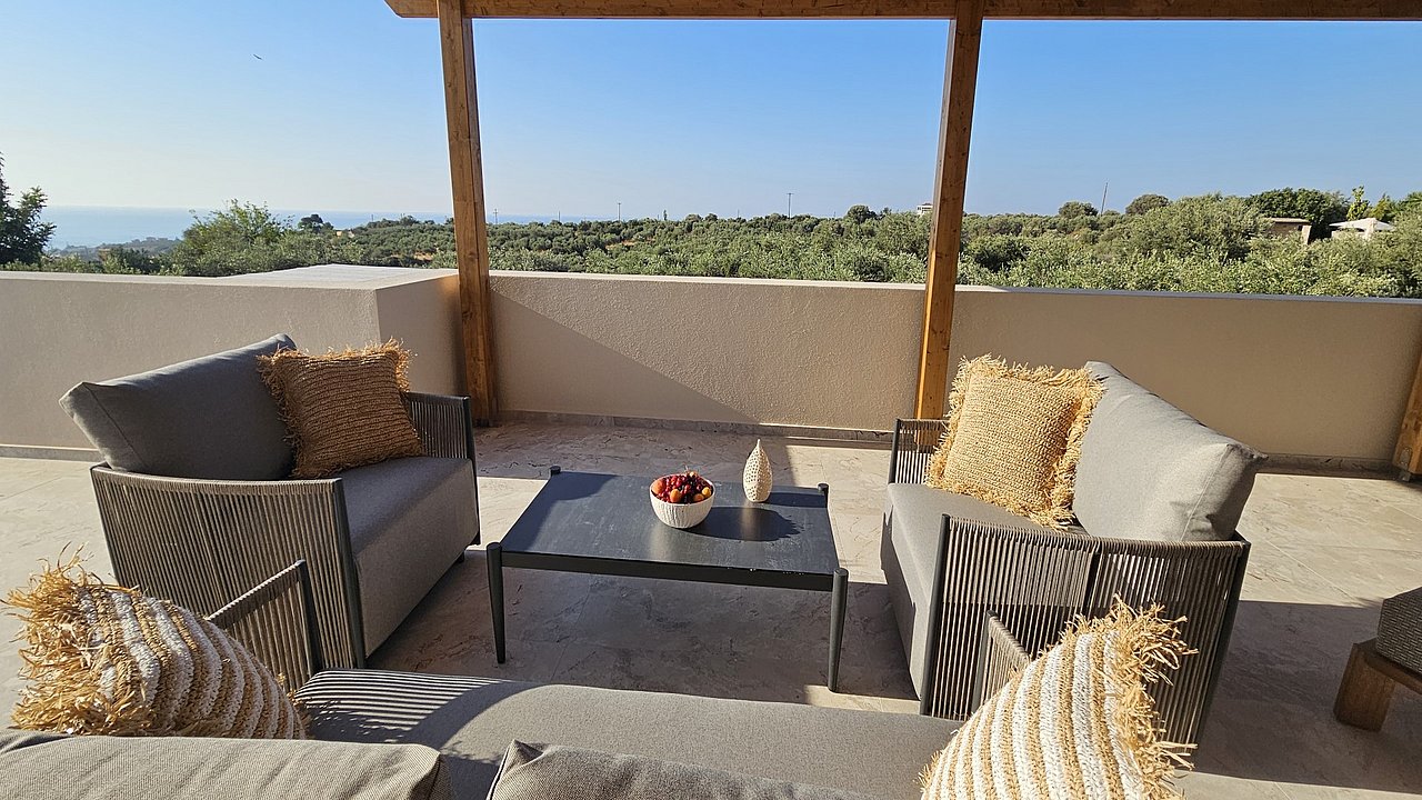 Willkommen in der Villa Ephelia, einem Stilvollen Luxuriösem Rückzugsort im Herzen Kretas- eingebettet in einem wunderschönen Olivenhain. Ausblicke über die sanften Hügel von den Weißen Bergen im Westen bis zum Psiloritis im Osten und vor Ihnen die blaue Ägäis. Die über 70qm große Dachterasse eröffnet atemberaubende Panoramablicke...Vom Sonnenaufgang bis zum leuchtenden Sternenhimmel. Diese exklusive Villa wurde mit viel Liebe zum Detail erbaut und bietet luxuriösen Komfort auf höchstem Niveau. Mit ca 176qm Wohnfläche auf einem 4.000qm großen Grunstück ist die Villa ideal für Paare, Familien oder Freunde, die Ruhe, Design und Natur in stilvoller Kombination erleben möchten. Bis zu vier Erwachsene plus Baby finden hier großzügig Platz und absolute Privatsphäre.