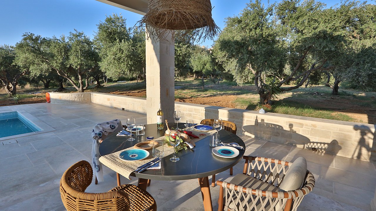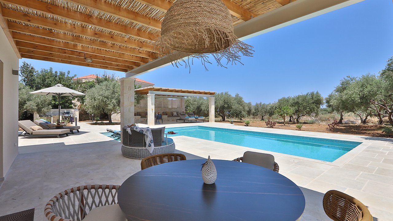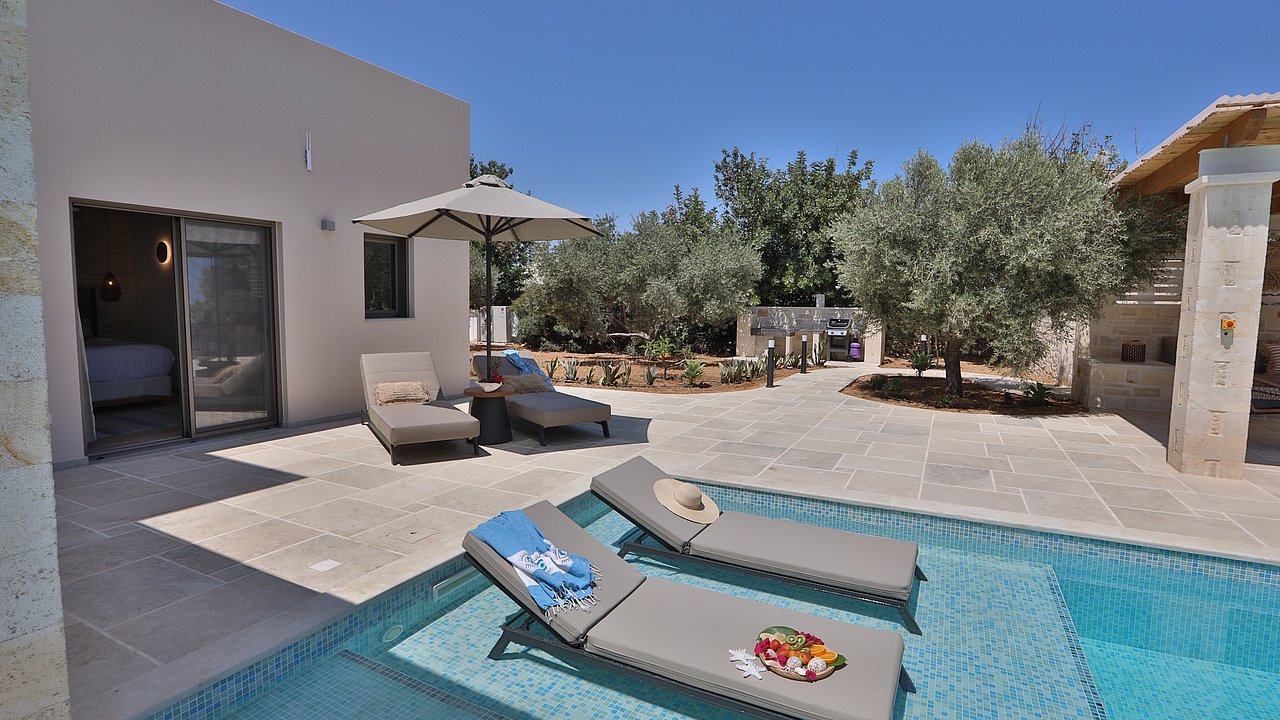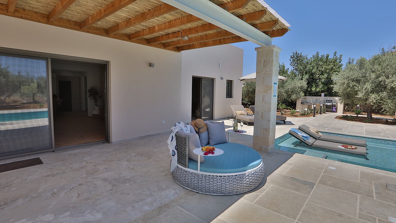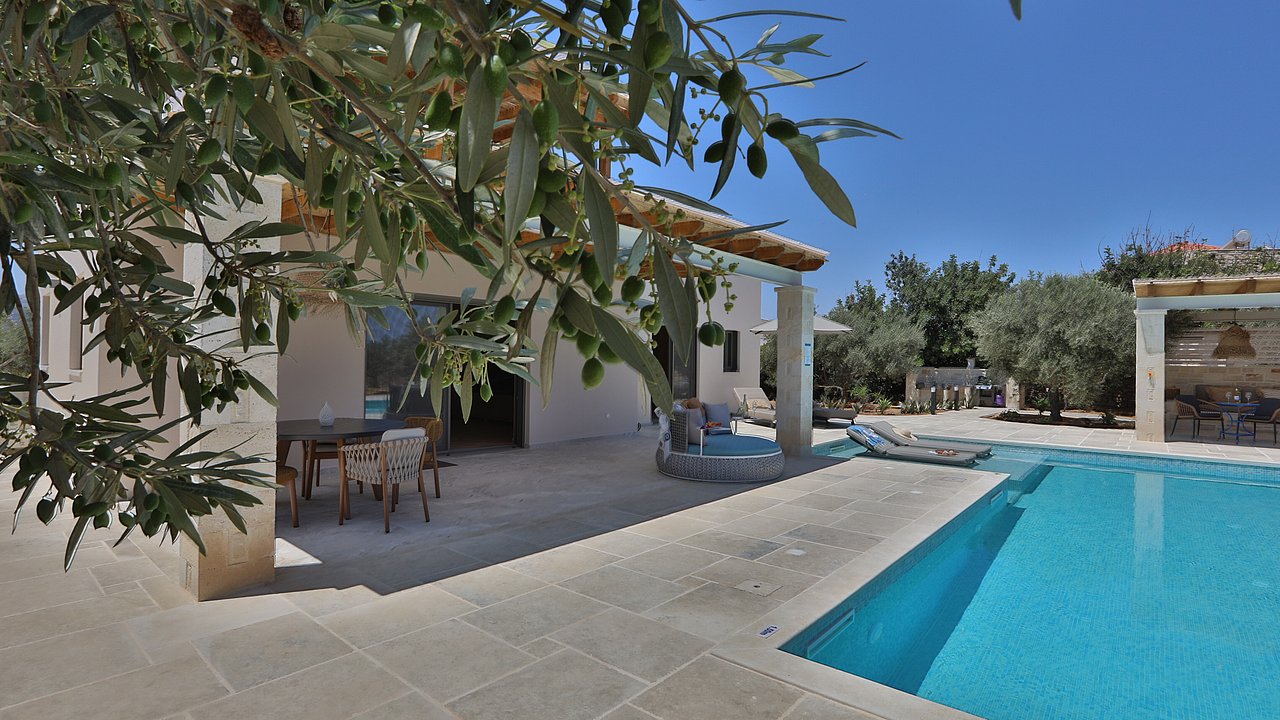 Willkommen in der Villa Ephelia, einem Stilvollen Luxuriösem Rückzugsort im Herzen Kretas- eingebettet in einem wunderschönen Olivenhain. Ausblicke über die sanften Hügel von den Weißen Bergen im Westen bis zum Psiloritis im Osten und vor Ihnen die blaue Ägäis. Die über 70qm große Dachterasse eröffnet atemberaubende Panoramablicke...Vom Sonnenaufgang bis zum leuchtenden Sternenhimmel. Diese exklusive Villa wurde mit viel Liebe zum Detail erbaut und bietet luxuriösen Komfort auf höchstem Niveau. Mit ca 176qm Wohnfläche auf einem 4.000qm großen Grunstück ist die Villa ideal für Paare, Familien oder Freunde, die Ruhe, Design und Natur in stilvoller Kombination erleben möchten. Bis zu vier Erwachsene plus Baby finden hier großzügig Platz und absolute Privatsphäre.