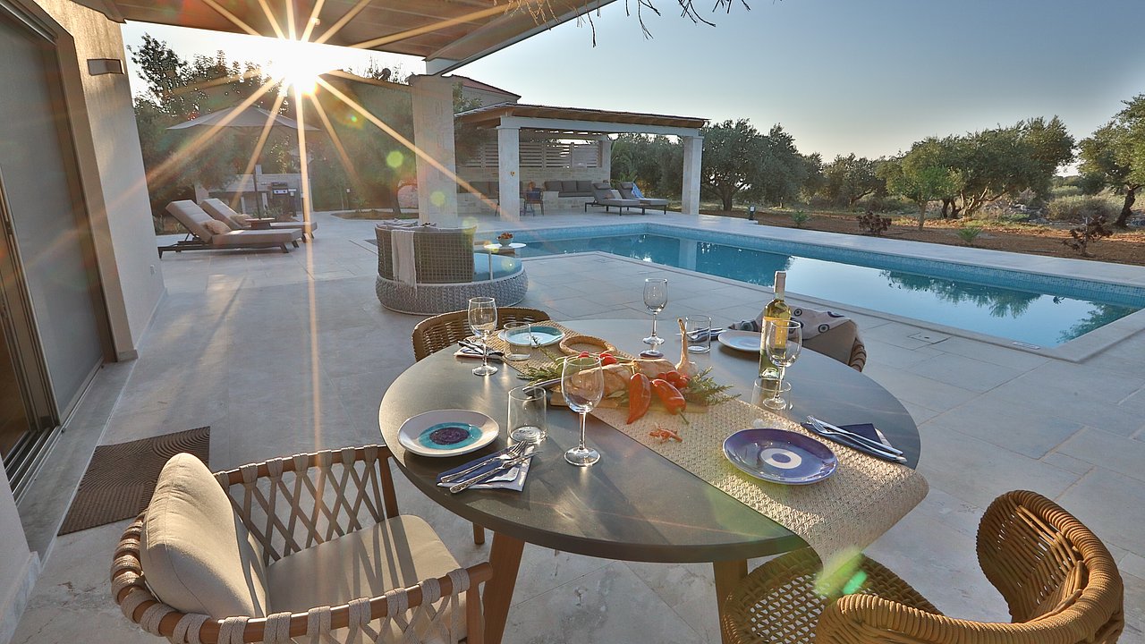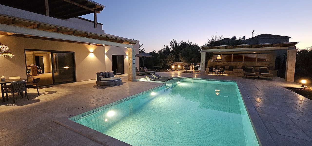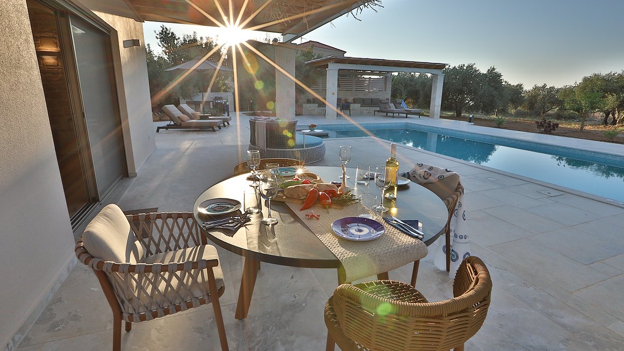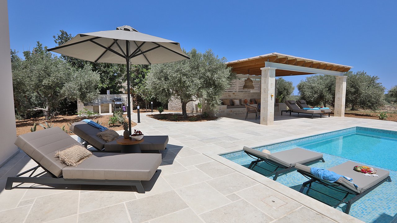 Mit eines der Herzstücke der Villa ist der weitläufige Außenbereich mit einem 56qm großem beheizbarem Pool (hautschondende Aufbereitung über Salz), inklusive Flachwasserzone-in der auch komfortable Liegen auf Sie warten. Besonders hautfreudlich und ideal zum Abkühlen oder Sonnenbaden. Der Poolbereich ist mit hochwertigen Liegen, Loungebereich und Bambus-Beschattung atmosphärisch gestaltet. Sowohl ein großer Essbereich, an dem das Essen doppelt so gut schmeckt. Genießen Sie den traumhaften Blick über Olivenhaine, Hügel und das glitzernde Meer.