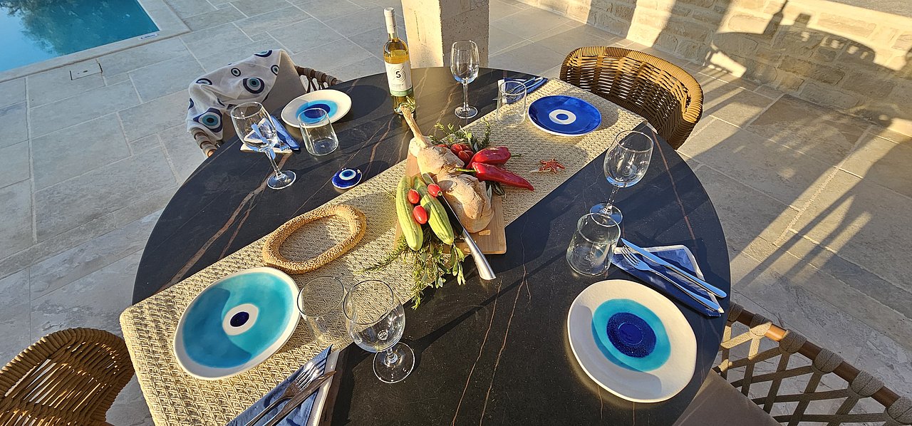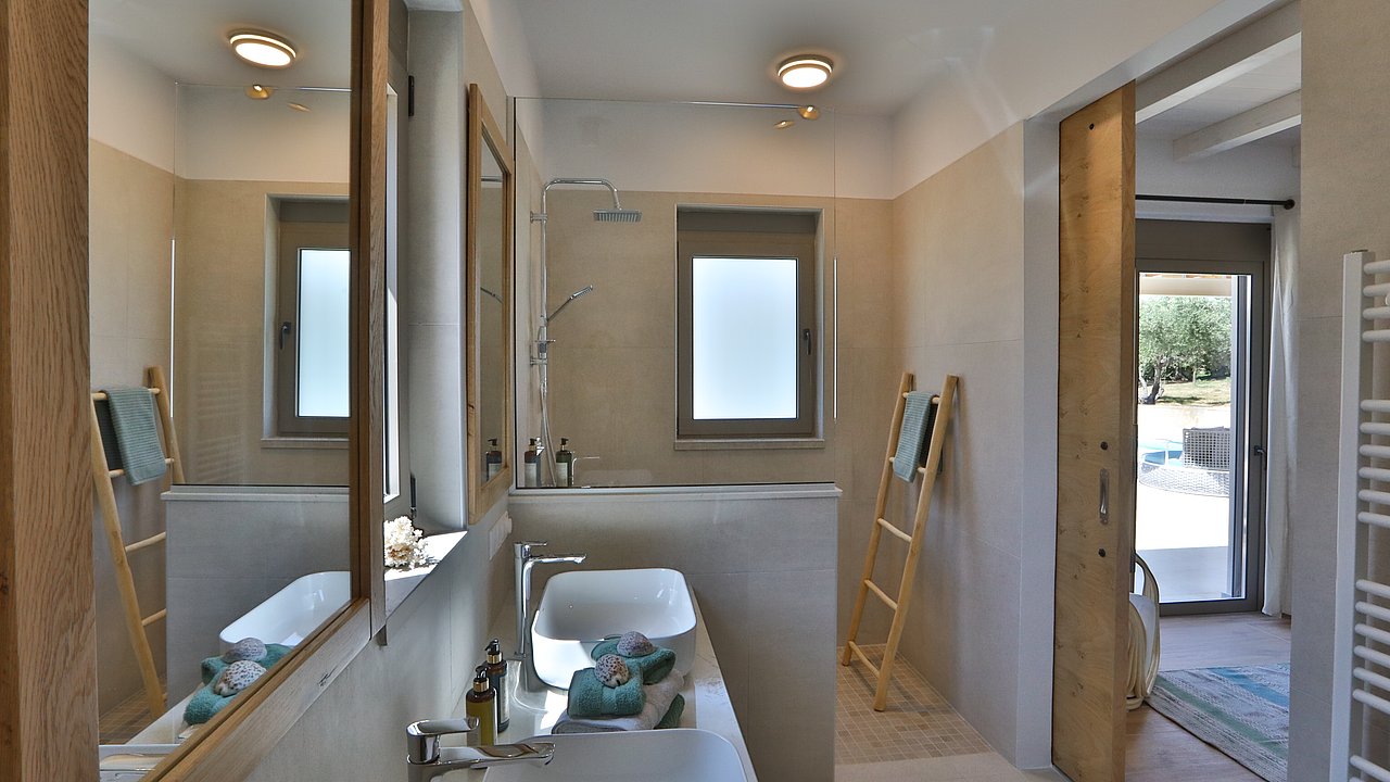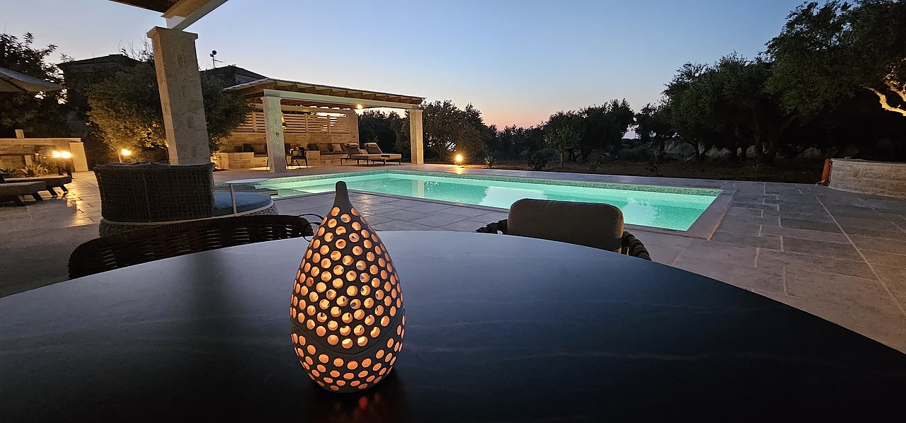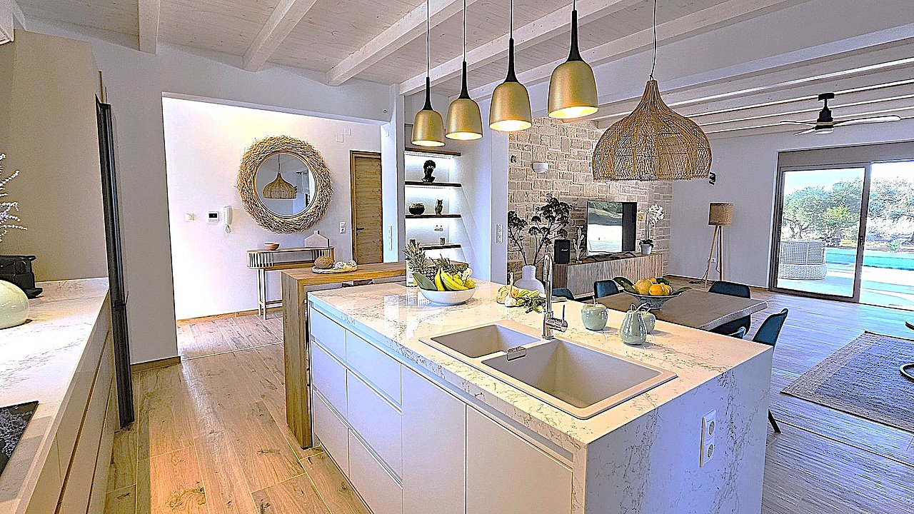 Mit eines der Herzstücke der Villa ist der weitläufige Außenbereich mit einem 56qm großem beheizbarem Pool (hautschondende Aufbereitung über Salz), inklusive Flachwasserzone-in der auch komfortable Liegen auf Sie warten. Besonders hautfreudlich und ideal zum Abkühlen oder Sonnenbaden. Der Poolbereich ist mit hochwertigen Liegen, Loungebereich und Bambus-Beschattung atmosphärisch gestaltet. Sowohl ein großer Essbereich, an dem das Essen doppelt so gut schmeckt. Genießen Sie den traumhaften Blick über Olivenhaine, Hügel und das glitzernde Meer.