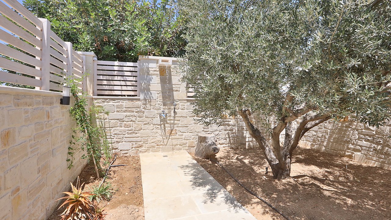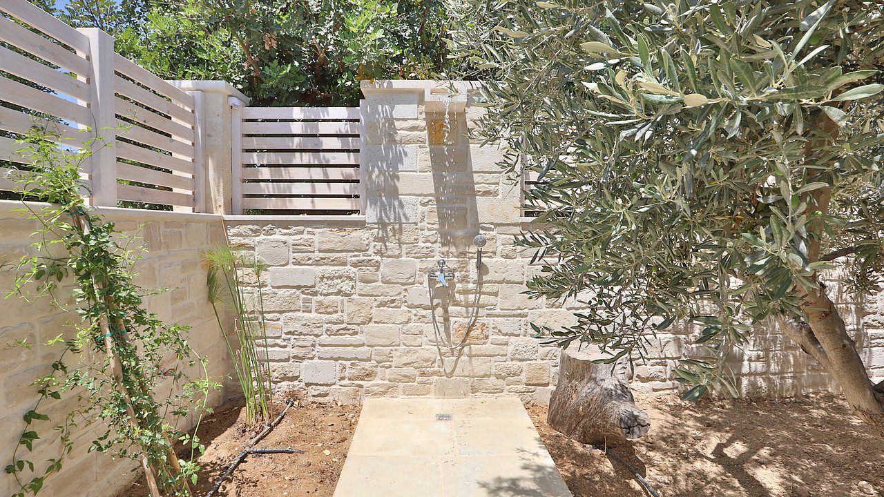 Ein besonderes Highlight ist die Beeindruckende große (5x7m), bepflanzte Ausenduschen (mit Warm-und Kaltwasser). Tauchen Sie ein in ein Meer aus Grün und Mediterranem Duft. Auch der Weg dort hin ist ein Erlebnis- ein sanft geschwungener, beleuchteter Weg führt an Olivenbäumen vorbei. Der Boden ist angenehm begehbar, das Licht taucht die Umgebung am Abend in eine ruhige, fast magische Stimmung-ein Gefühl wie an einem privaten Open-Air-Spa- umgeben von Natur und Stille. Die Magie ist natürlich nicht nur an der Außendusche zu finden , sondern erstreckt sich sich über den ganzen Außenbereich.