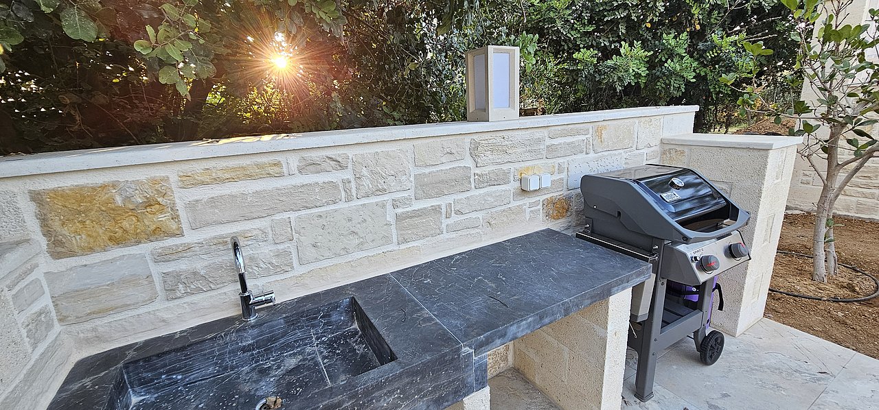 Nicht nur innen können Sie ihre Kochkunst entfalten und geniesen- auch im Ausenbereich steht Ihnen ein zusätzlicher Gasgrill mit Spülbecken und Arbeistsfläche zur Verfügung- perfekt für laue Abende unter freiem Himmel.
