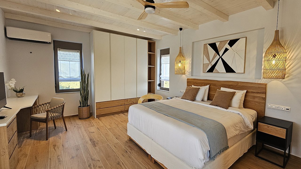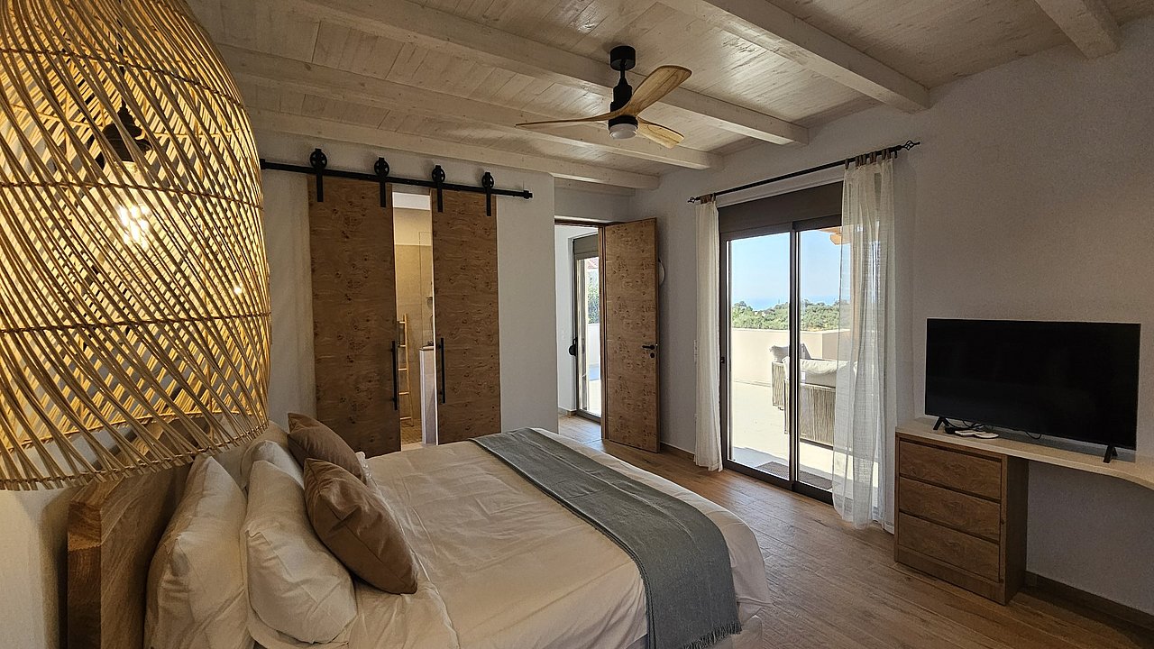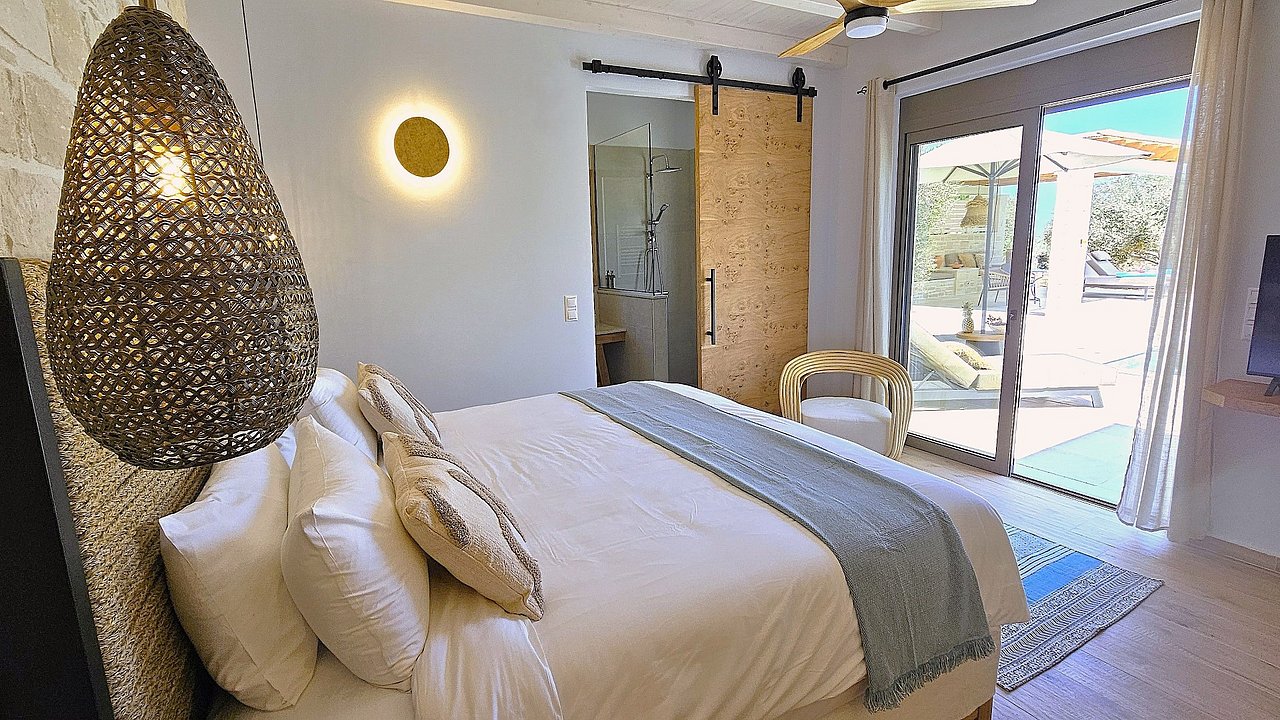 Das untere Schlafzimmer führt durch eine große Glastür direkt zu dem Poolbereich- ideal für ein erfrischendes Bad direkt am Morgen oder eine ruhige Auszeit im Schatten der Olivenbäume.