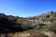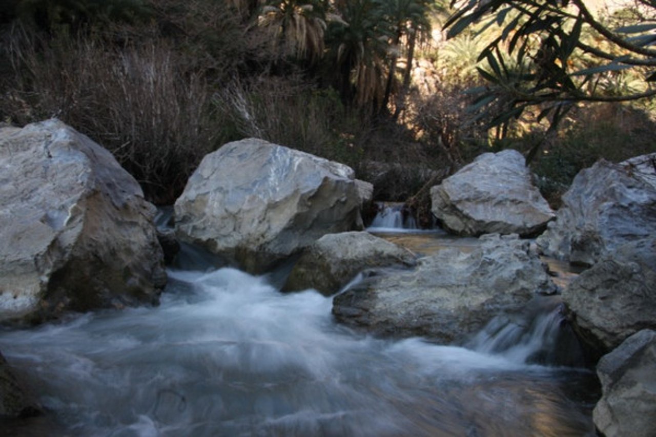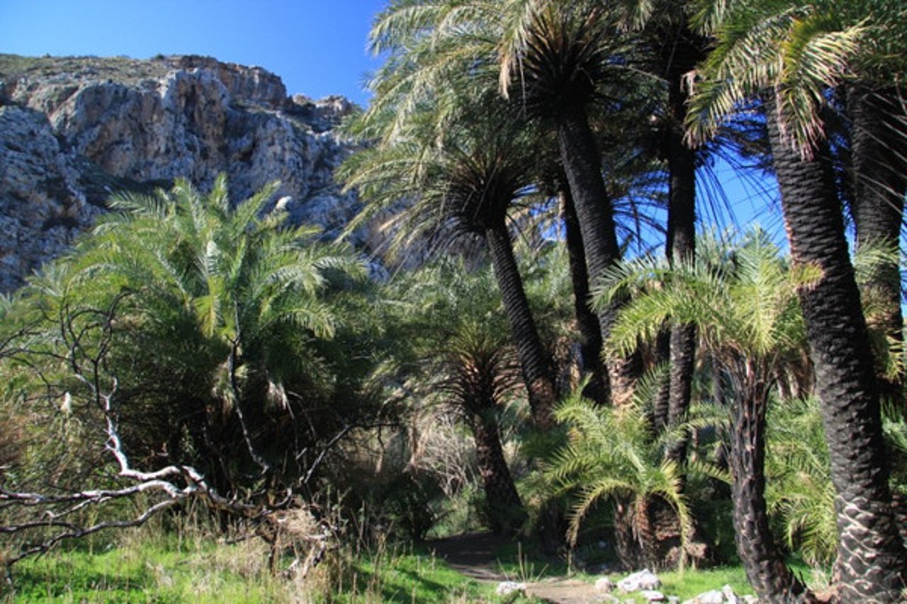 Hinter dem Strand bildet der Megalopotamos, ein aus dem Kouroupa-Gebirge kommender Bergbach, den kleinen Teich - oder See von Preveli, der sich bis in die dahinter befindliche Schlucht hineinzieht. Die Kretische Dattelpalme (Phoenix theophrasti) bildet hier einen natürlichen Palmenhain.